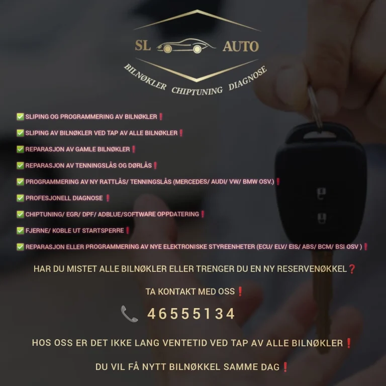 Vi i SL Auto har stort lagerbeholdning med nøkler og fjernkontroll til de fleste bilmerker. Noen nøkler kan repareres her og sendes med posten, men nyere nøkler må fysisk programmeres og kodes om til bilen og da må kjøretøyet bringes til oss. Hvis alle nøklene er mistet da kan vi komme og hjelpe til der du befinner deg! Hos oss settes kunden i fokus og hver henvendelse vil bli besvart umiddelbart!